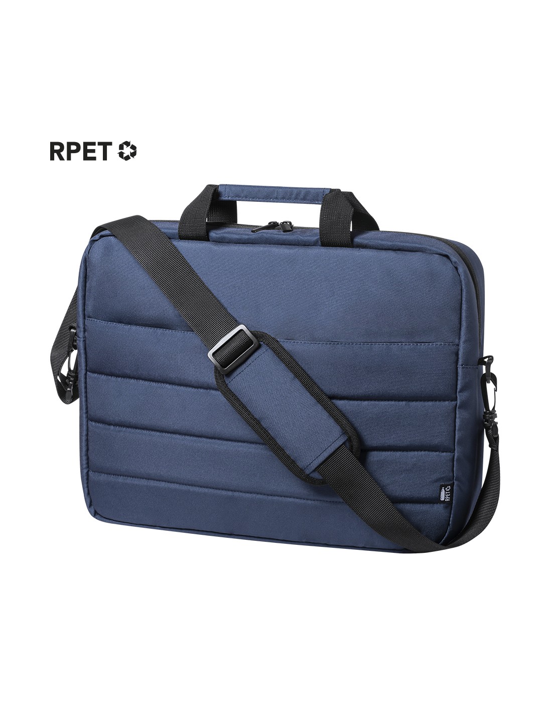 Maletín de línea nature con diseño urbano y acolchado total. Fabricado en resistente RPET 300D elaborado a partir de plástico reciclado, para así fomentar la reutilización de residuos plásticos y contribuir a la sostenibilidad del planeta. Accesorio para ajuste en trolley, con compartimento interior acolchado para ordenador portátil de hasta 15 pulgadas. Bolsillo principal con cierre de cremallera y tirador metálico. Cómodas asas de transporte reforzadas y cinta bandolera ajustable, con refuerzo acolchado para hombro y cierres giratorios de mosquetón. Distintivo RPET en etiqueta. Acolchado. Bolsillo Acolchado para Portátil