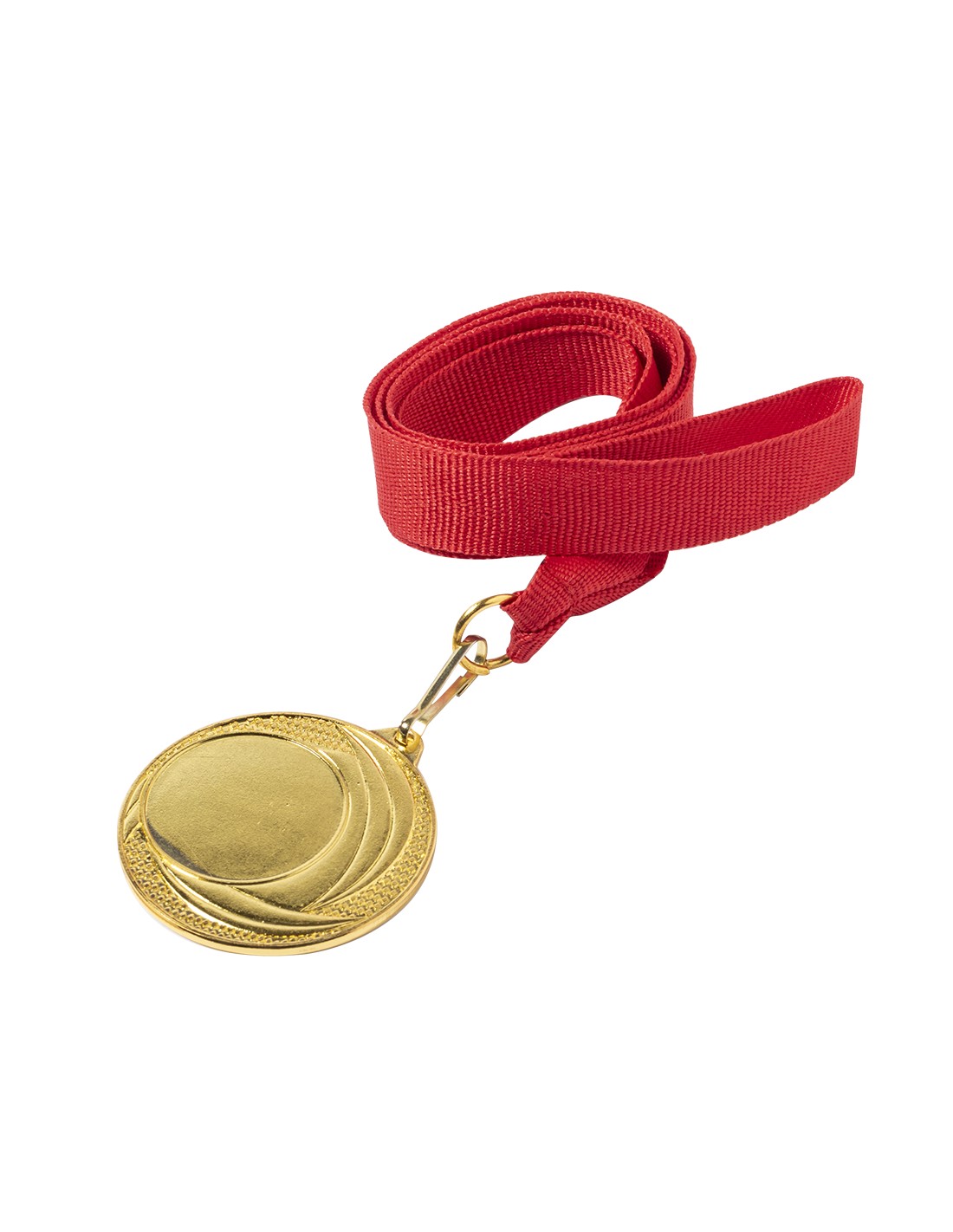 Medallas metálicas personalizadas con acabado dorado en relieve. Con cinta de poliéster en rojo y mosquetón metálico a juego. Disponibles solo en color dorado, ideales para eventos competitivos promocionales. Material: Metal y poliester Tamaño: 5Ø medalla / 48 cm cinta Peso: 25 g