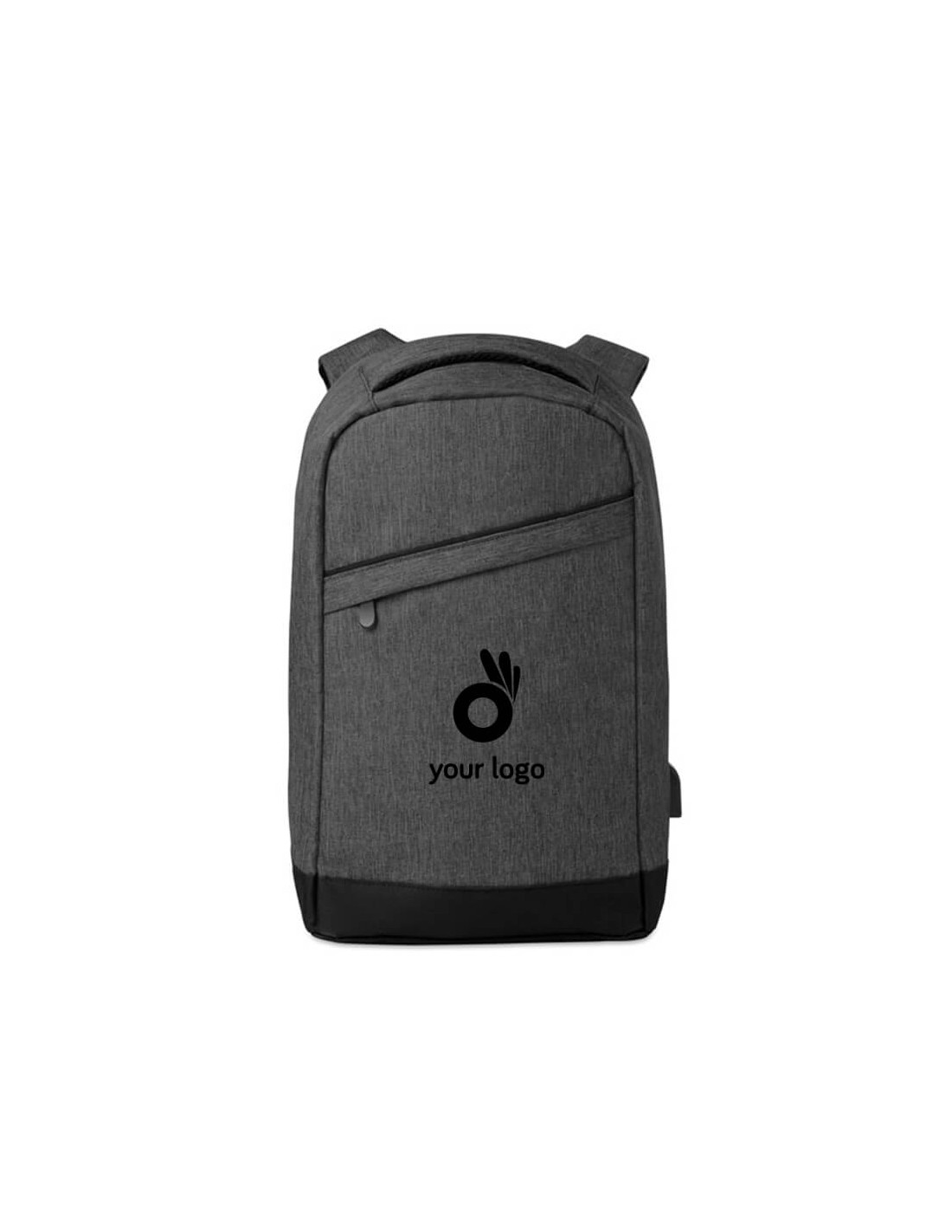 Mochila jaspeada en poliéster 600D con correas acolchadas. Incluye compartimento interno para portátil de 13'' y conector de carga USB. Cremallera de compartimento principal en parte interna para una mayor protección.