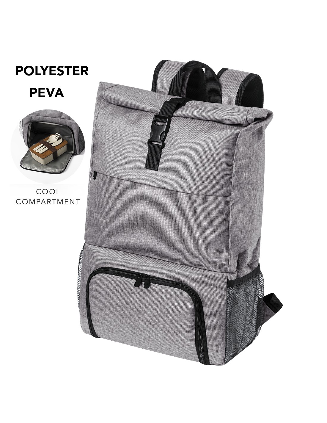 Mochilas multiusos de poliéster con diseño urbano. Incluyen compartimento isotérmico para fiambreras, compartimento principal con cierre de seguirdad y bolsillos laterales.