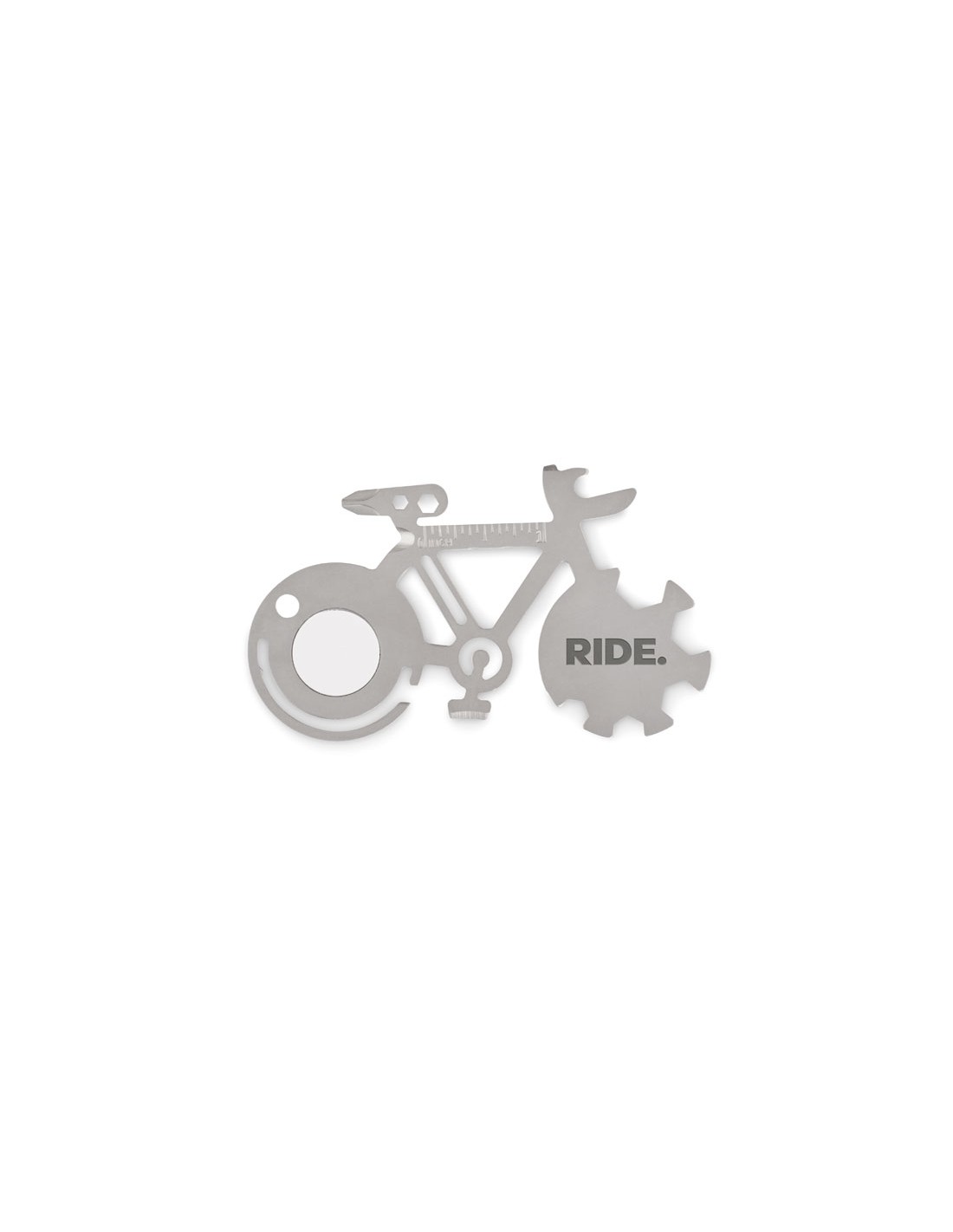 Multiherramienta 11 en 1 de acero inoxidable con forma de bicicleta. Desde abridor de botellas, cuchillo, regla o destornillador Phillips.