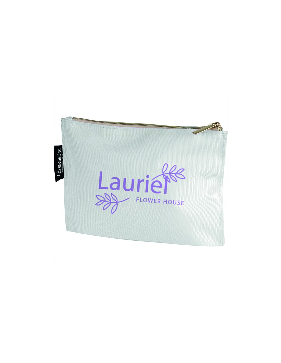 Neceseres corporativos con cremallera metálica. Estos neceseres están fabricados con RPET, confeccionados a partir de botellas de plástico recicladas. Están disponibles en color blanco y negro. Son ideales para personalizarlos y destacar frente a la competencia.