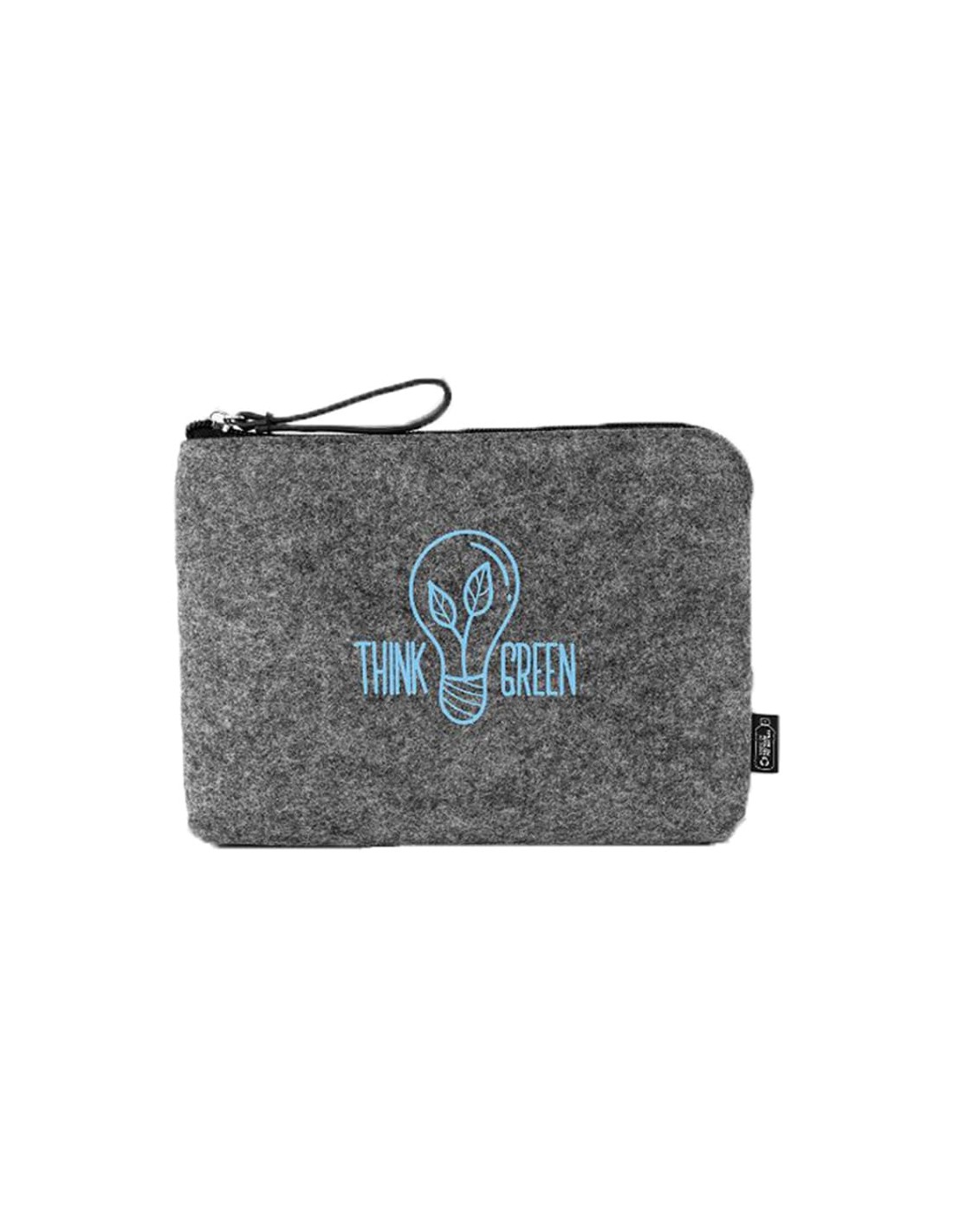 Neceseres fabricado con fieltro 100% RPET en color gris oscuro y tirador de cuero sintético largo. Elegantes neceseres de fieltro grandes para introducir todo lo necesario en su interior. Puedes incorporar tu logotipo de empresa en su frontal y promocionarte de forma original