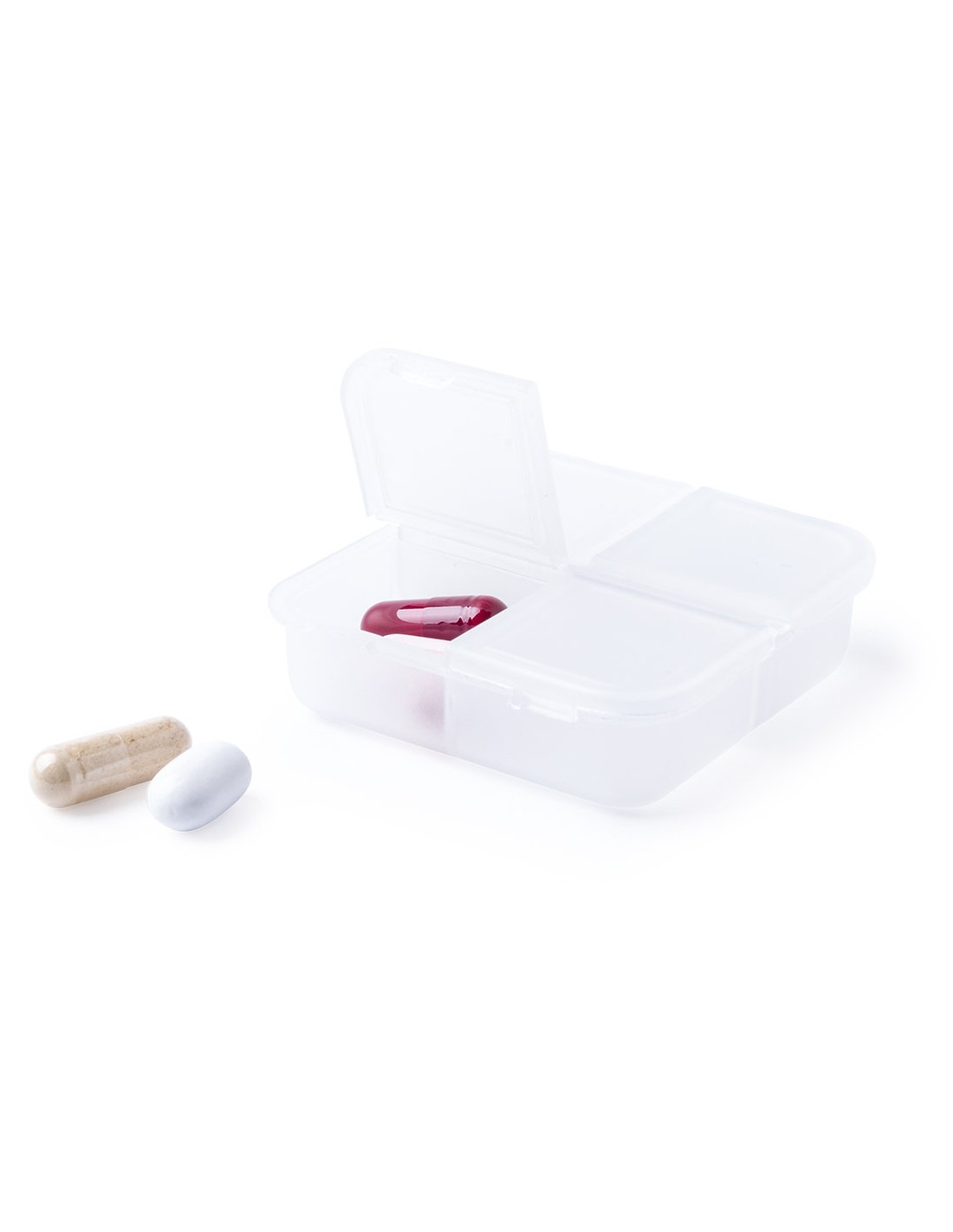 Pastillero de 4 compartimentos en material ABS de acabado translúcido y libre de BPA. Con tapa individual por compartimento. 4 Compartimentos