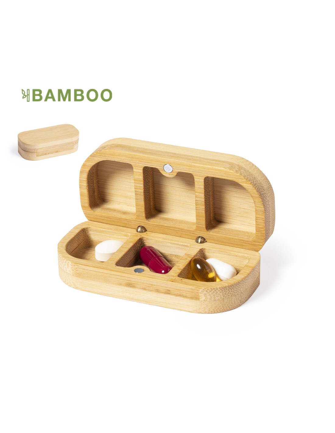 Pastillero de línea nature fabricado en bambú. Con 3 compartimentos interiores y cierre magnético. 3 Compartimentos