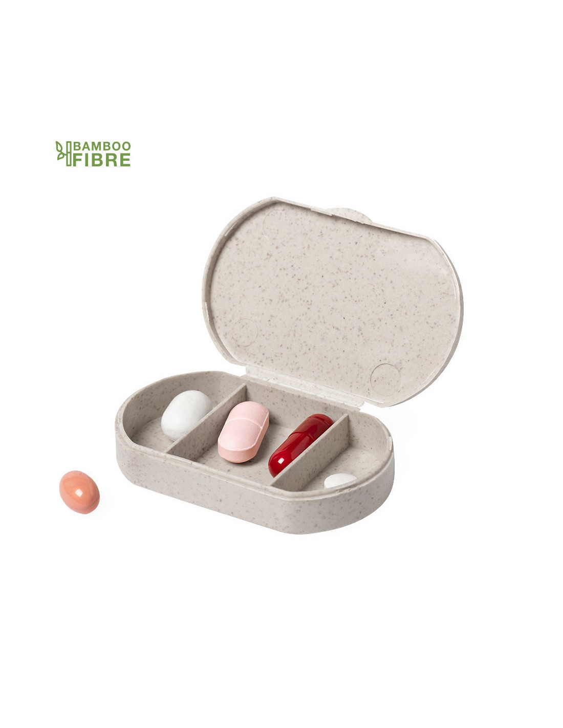 Pastillero en línea nature, fabricado en fibra de bambú. Con 3 compartimentos y cierre de seguridad. 3 Compartimentos