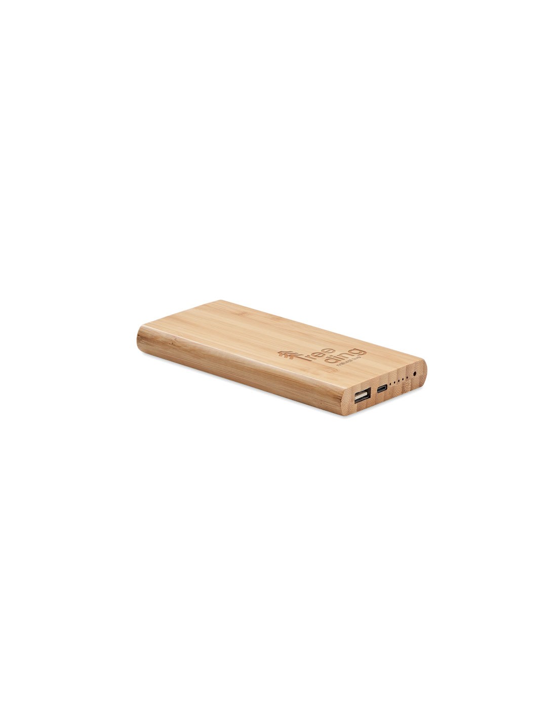 Power bank de 6000 mAh de capacidad con carcasa de bambú. Output DC5V/2A. Incluye luz indicadora de carga y cable USB con enchufe tipo C. El bambú es material natural, el color del articulo puede variar.