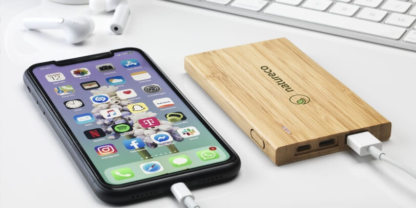 Si tenemos presente el material con el que están fabricadas las baterías portátiles personalizadas y los cargadores inalámbricos, puedes adquirir baterías externas fabricadas en aluminio o en materiales ecológicos como el bambú, la paja de trigo o la caña de trigo. También encontrarás cargadores inalámbricos personalizados que son ecológicos ya que están fabricados en corcho natural o madera.