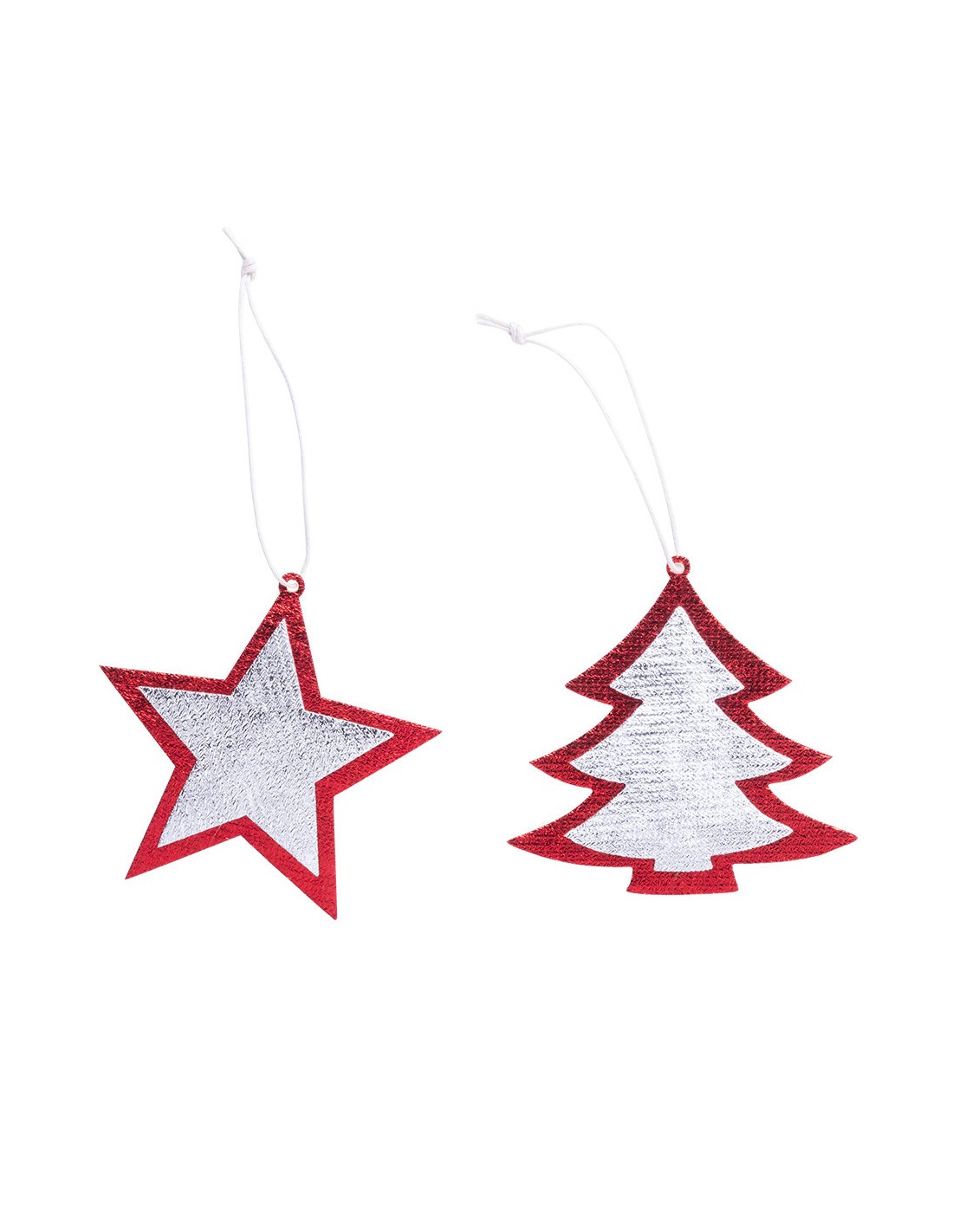 Set de figuras de Navidad con logo para colgar en cualquier espacio. El set incluye un arbol y una estrella navideñas, confeccionadas con material Non-Woven y adaptadas para marcar cualquier tipo de logo y dar un ambiente navideño a tu espacio de trabajo. Da un paso más y personaliza estas figuras de Navidad para quue tu marca esté presente en cualquier lugar. El set de figuras navideñas se encuentra disponible en color plata con detalles rojos. Material: Non-Woven Medidas: 8 x 8 x 0,8 cm Peso: 3 g