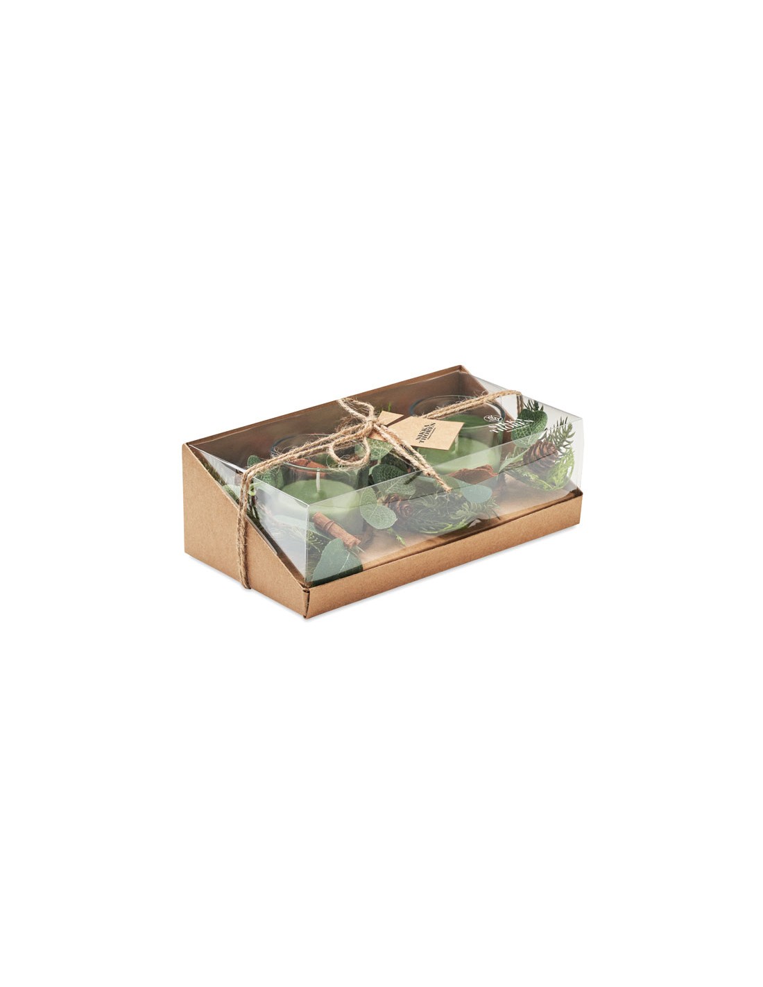 Set de 2 porta velas de cristal (120 gr) con decoración de bosque. Presentado en caja de cartón y PVC con cordón de yute y etiqueta kraft. Velas incluidas.