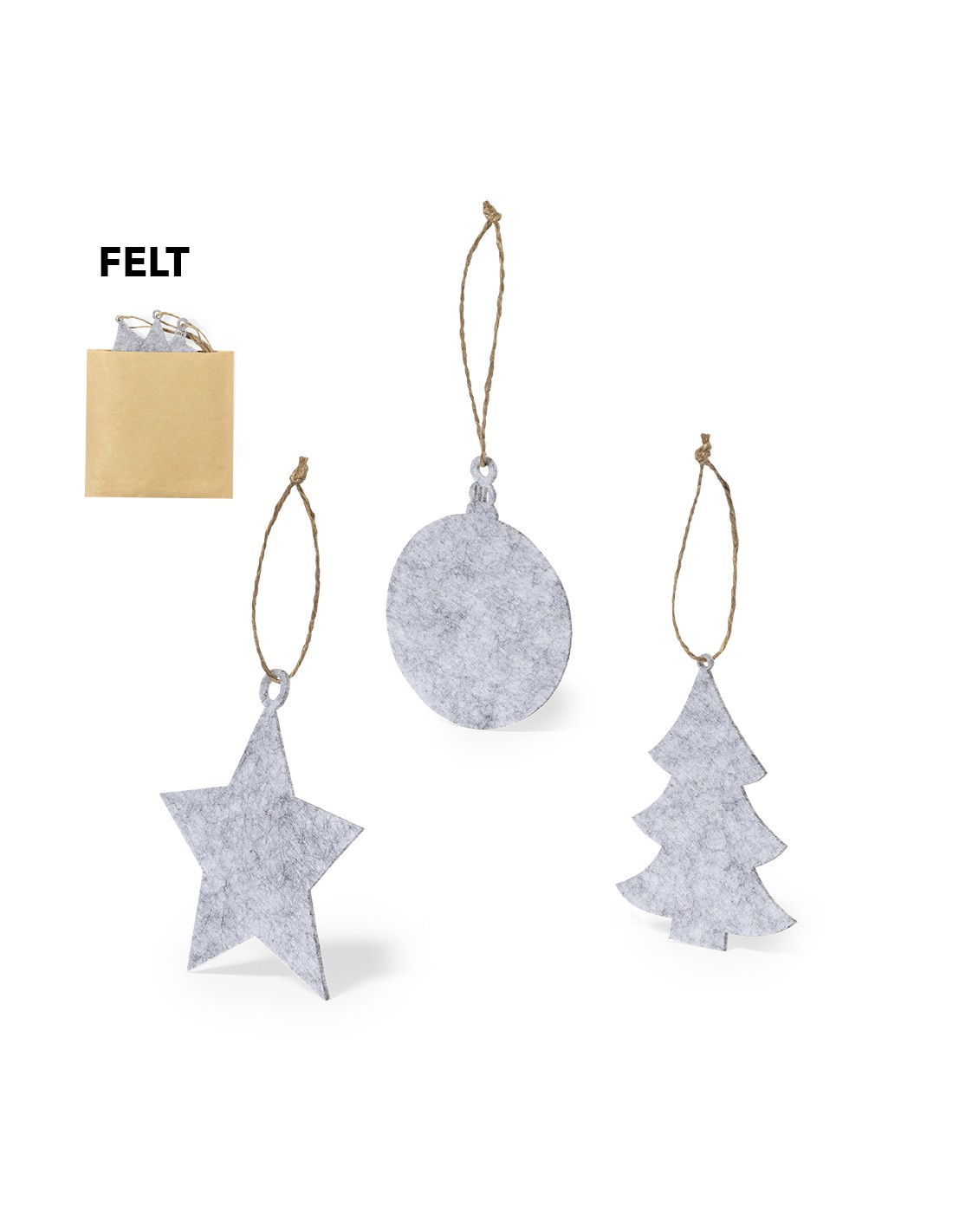 Sets de 3 adornos navideños (árbol de Navidad, estrella y bola navideña) fabricados en fieltro y con colgador