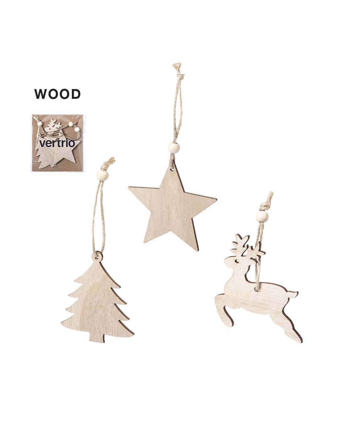 Sets de 3 figuras navideñas: estrella, reno y árbol de Navidad con lazo de yute. Presentación en una bolsa individual con cartón interior