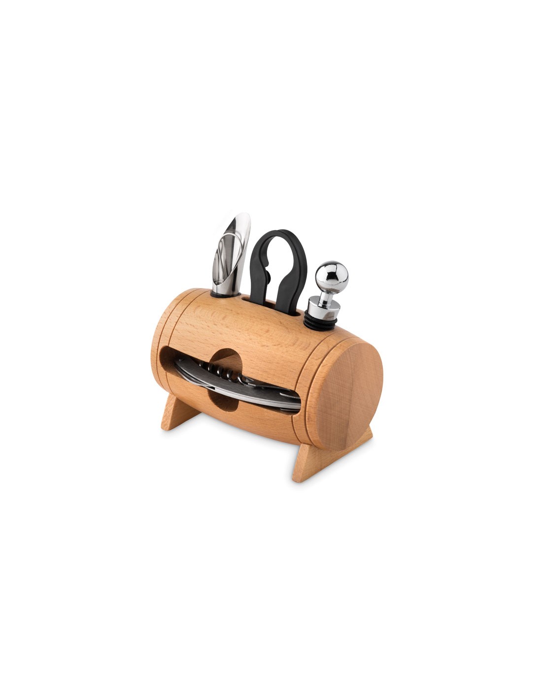 Sets personalizados de accesorios para vino en forma de barril. Son sets realizados en resistente madera que incluyen 4 accesorios para vino: sacacorchos, tapón, dosificador de vino y corta cápsulas. Material: Madera Medidas: 13 x 8 x 14 cm Peso: 48 g