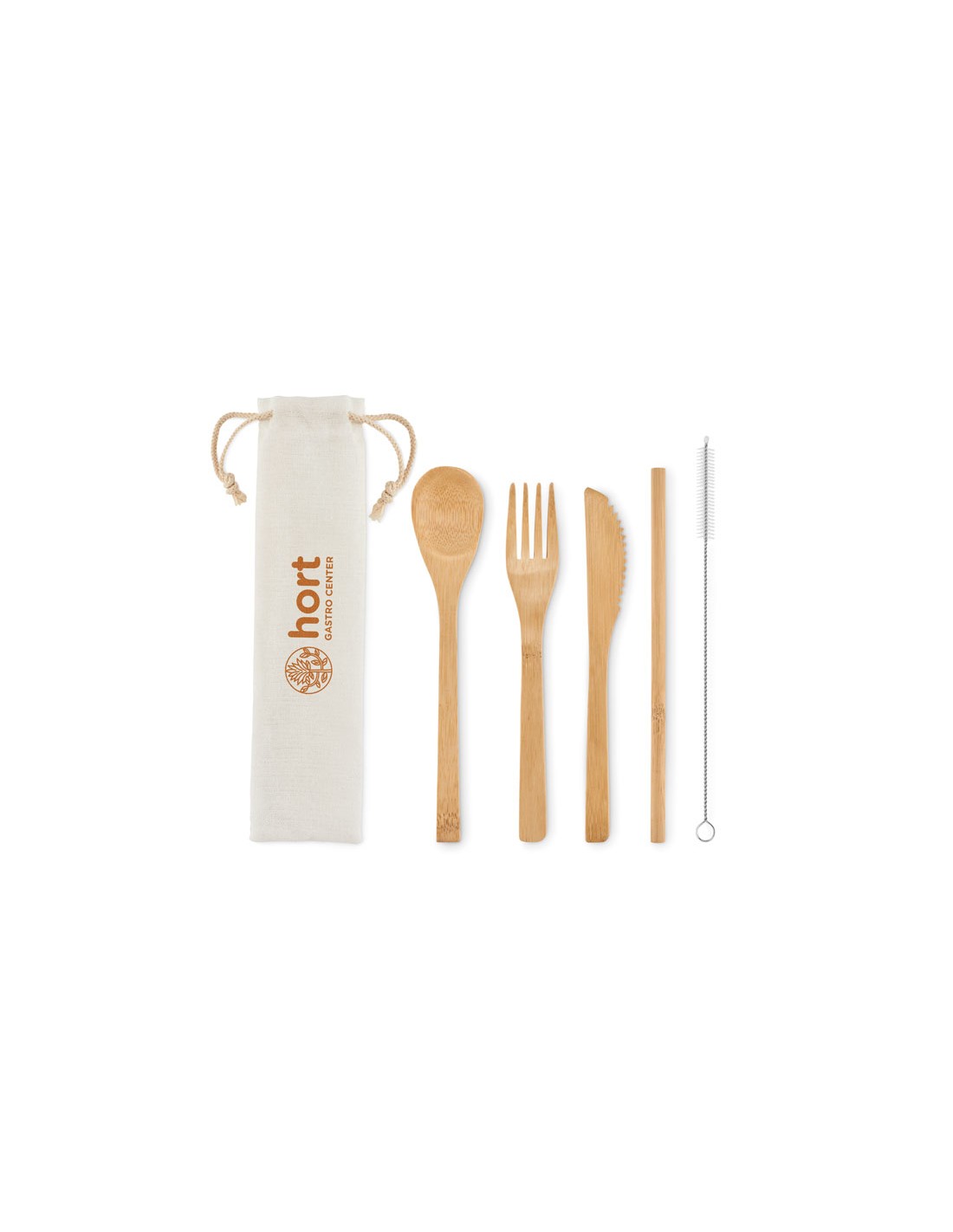 Set de cubiertos fabricados en bambú. Presentado en funda de canvas. Incluye tenedor, cuchara, cuchillo y pajita con cepillo limpiador de acero inoxidable.