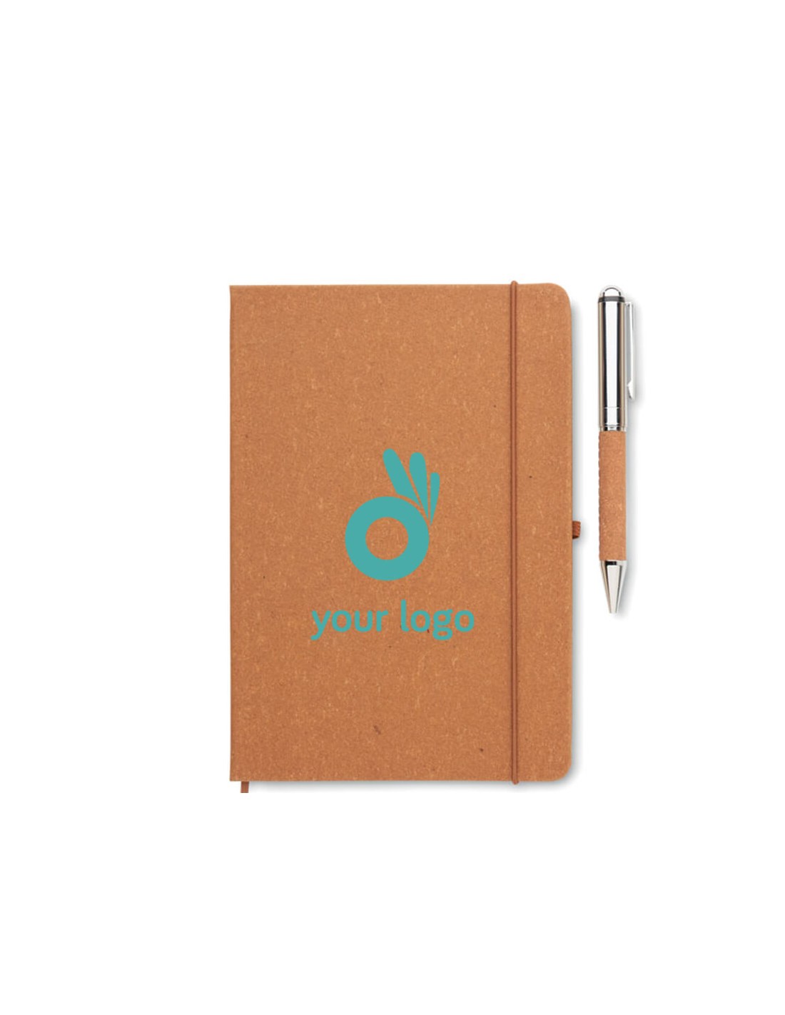 Set de regalo. Libreta A5 de piel reciclada (75%) con tapa dura. 160 páginas rayadas (80 hojas). Banda elástica a juego, cinta marcapáginas y portabolÃgrafos. BolÃgrafo metálico giratorio a juego. Tinta azul. Presentado en caja de papel kraft.