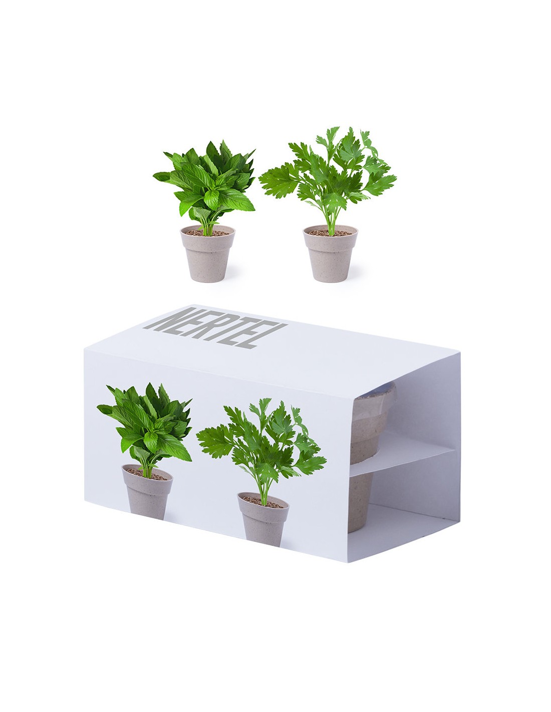 Set de dos macetas publicitarias con semillas de menta y perejil plantadas en maceteros línea nature. Incluye bolsa con sustrato de crecimiento y semillas para ambas macetas. Son perfectas para la decoración de despacho y oficinas incluyendo el logo corporativo de tu empresa. Material: Biodegradable Medidas: 15 x 7 x 7 cm Peso: 102 g