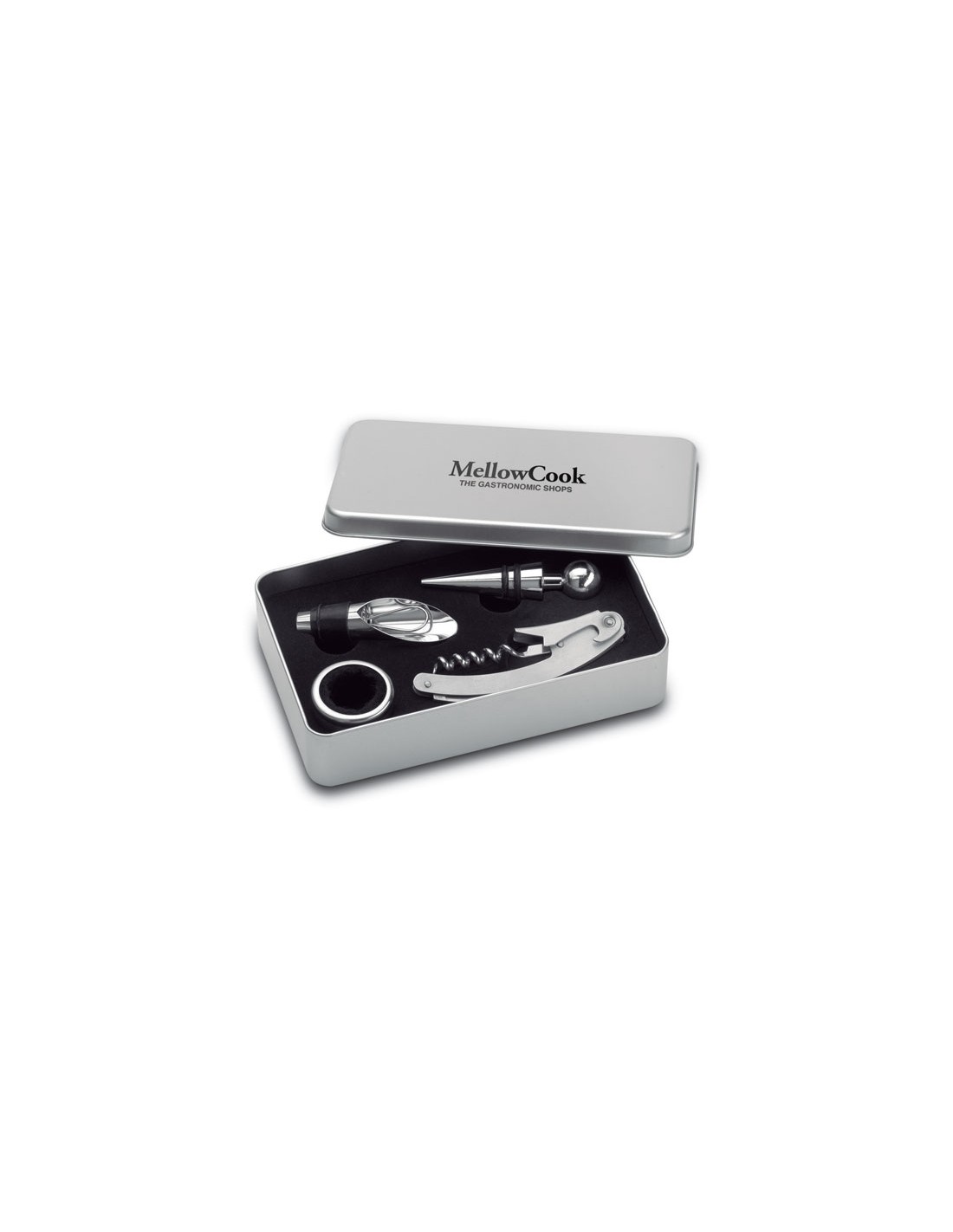 Sets de vino personalizados en caja metálica. Se trata de un modelo de sets con accesorios para vino con un diseño moderno y elegante gracias a su acabado metálico. Incluyen un sacacorchos, tapón, dosificador y anillo anti goteo. Añade tu logo y promociona tu negocio de la manera más original. Material: Metal Medidas: 18 x 11 x 4 cm Peso: 385 g