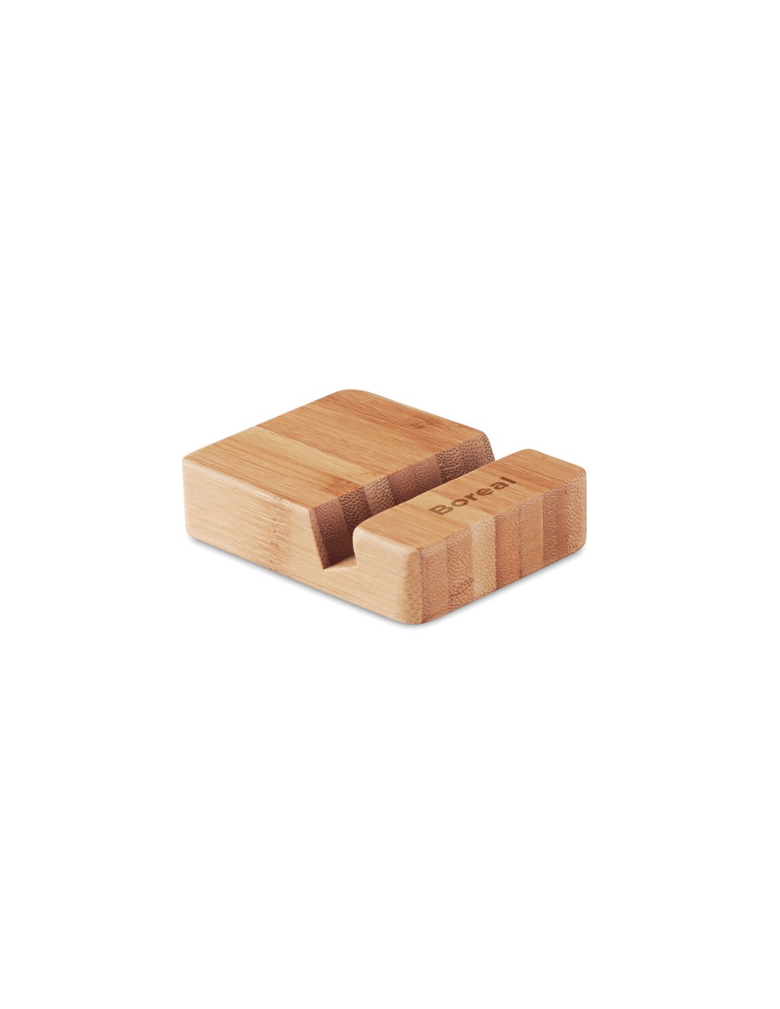 Soporte para teléfono de bambú. El bambú es un material natural, el color del articulo, la medida y la impresión sobre el puede variar.