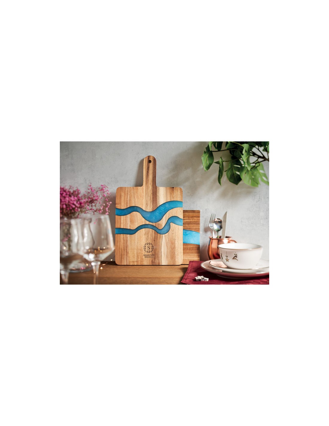 Tabla de servir de madera de acacia con mango y detalle con resina epoxi. La madera es un material natural, el color del articulo puede variar de unas piezas a otras.