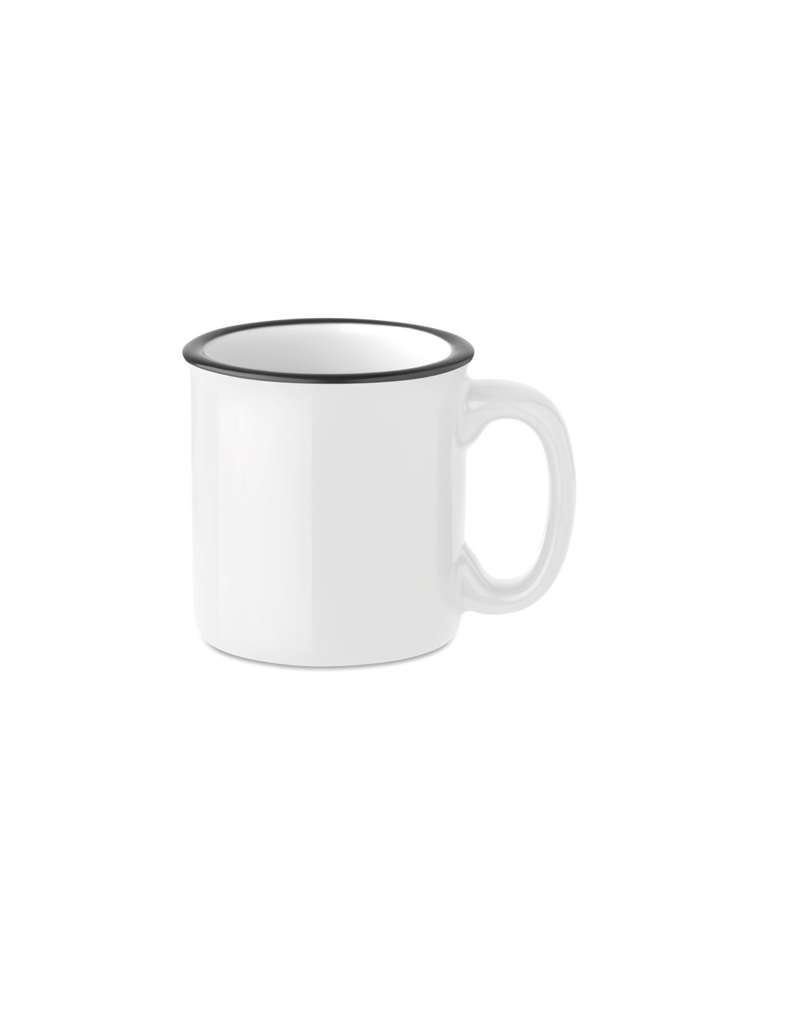 Tazas de cerámica publicitarias de estilo vintage con el borde superior en color negro. Con una capacidad de 240 ml, estas tazas se pueden llevar fácil y cómodamente dado que ocupan poco espacio y son relativamente ligeras. Este tipo de regalos promocionales están de moda en la mayoría de eventos gracias a su gran utilidad. el impacto visual que generan es considerable, además de ser un tipo de producto que encaja a la perfección con cualquier tipo de público. Añade tu logo y colócalo donde más te guste para recibir tus tazas totalmente personalizadas. Material: Cerámica Medidas: 8,5 x 8,5 cm Peso: 302 g