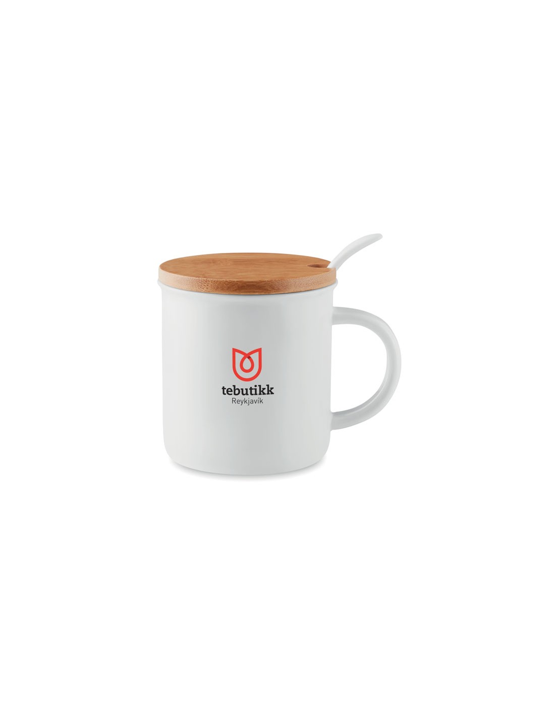 Taza de porcelana con cuchara y tapa de bambú. Embalaje con caja individual. Marcaje en tampografía no es apto para lavavajillas. Transfer cerámico es apto para lavavajillas. Capacidad 380 ml. El bambú es un material natural, el color del articulo, la medida y la impresión sobre el puede variar.