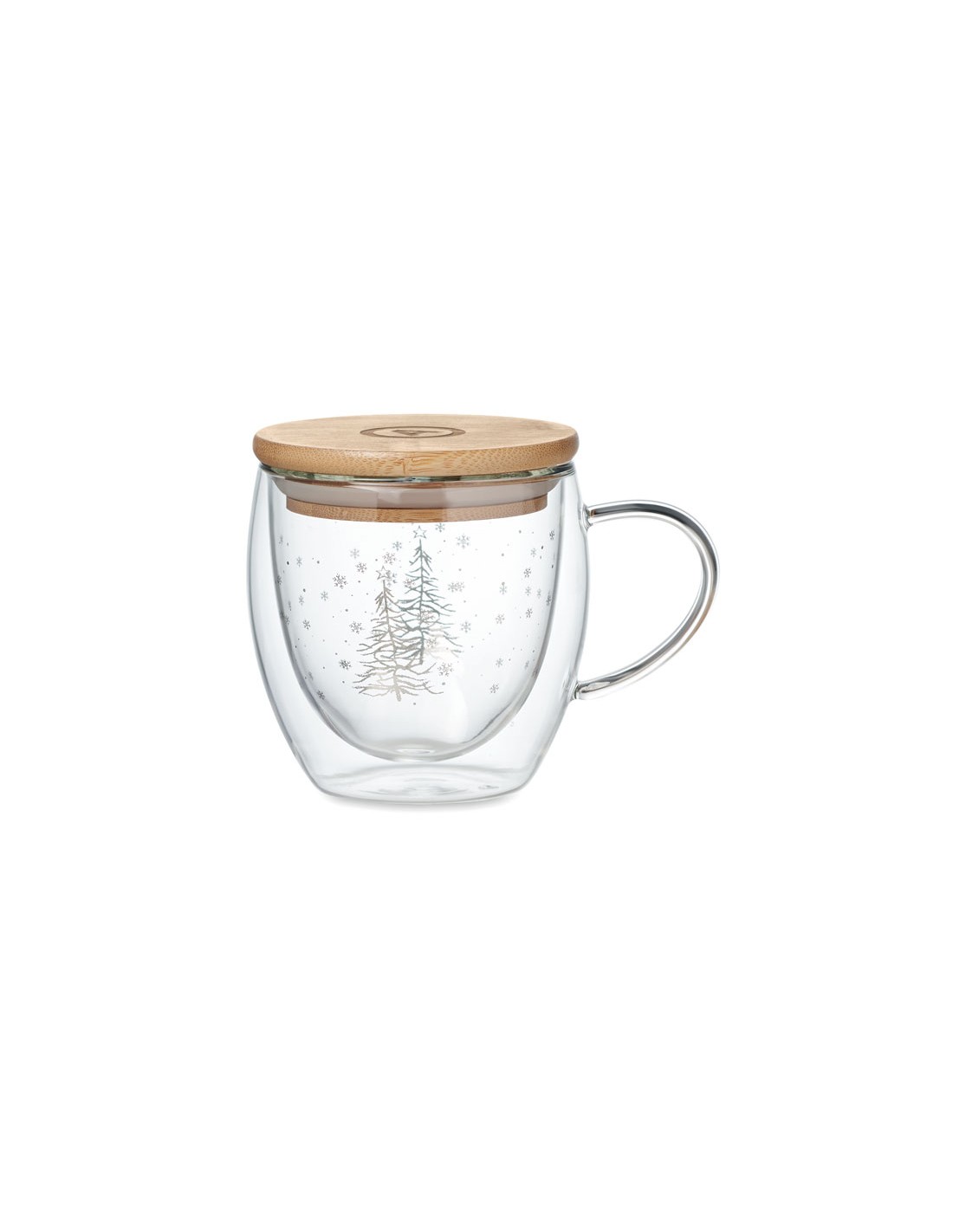 Taza de borosilicato de doble pared con diseño de árbol en el interior de la taza y tapa de bambú. Capacidad: 220 ml. El bambú es material natural, el color del articulo puede variar.