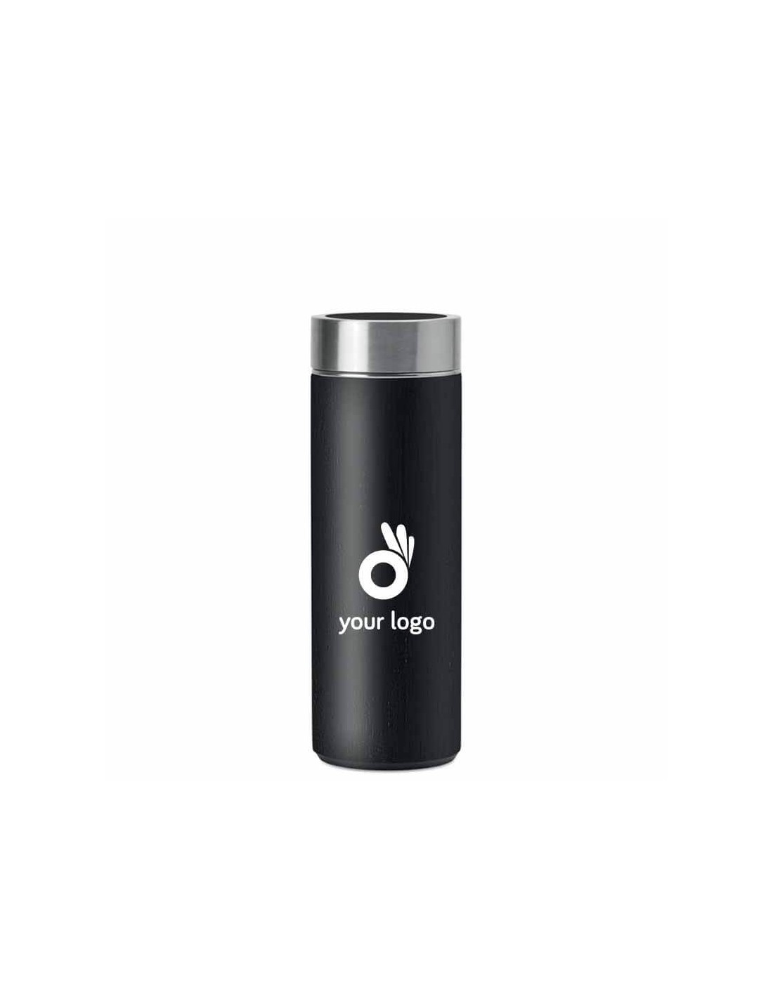 Termo de acero inoxidable de doble capa con carcasa y tapa de bambú e infusor de té. Capacidad: 400 ml. Como el bambú es un material natural, el color por artículo puede variar.