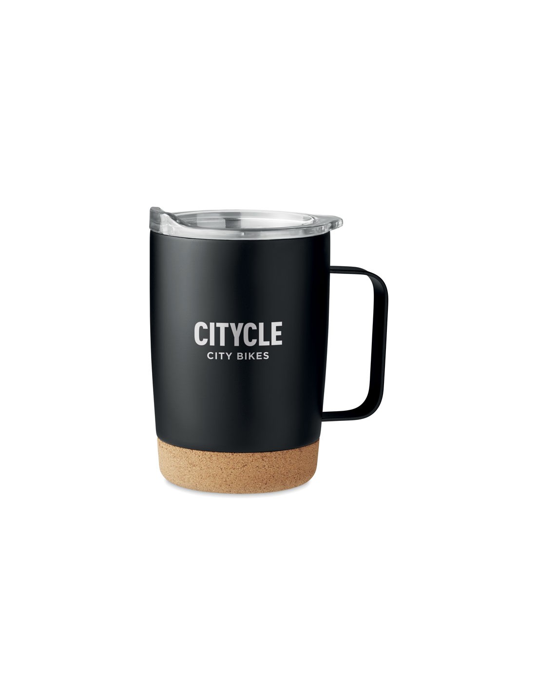 Vaso de acero inoxidable de doble pared con base de corcho y tapa con orificio deslizante para beber. Capacidad: 300 ml.