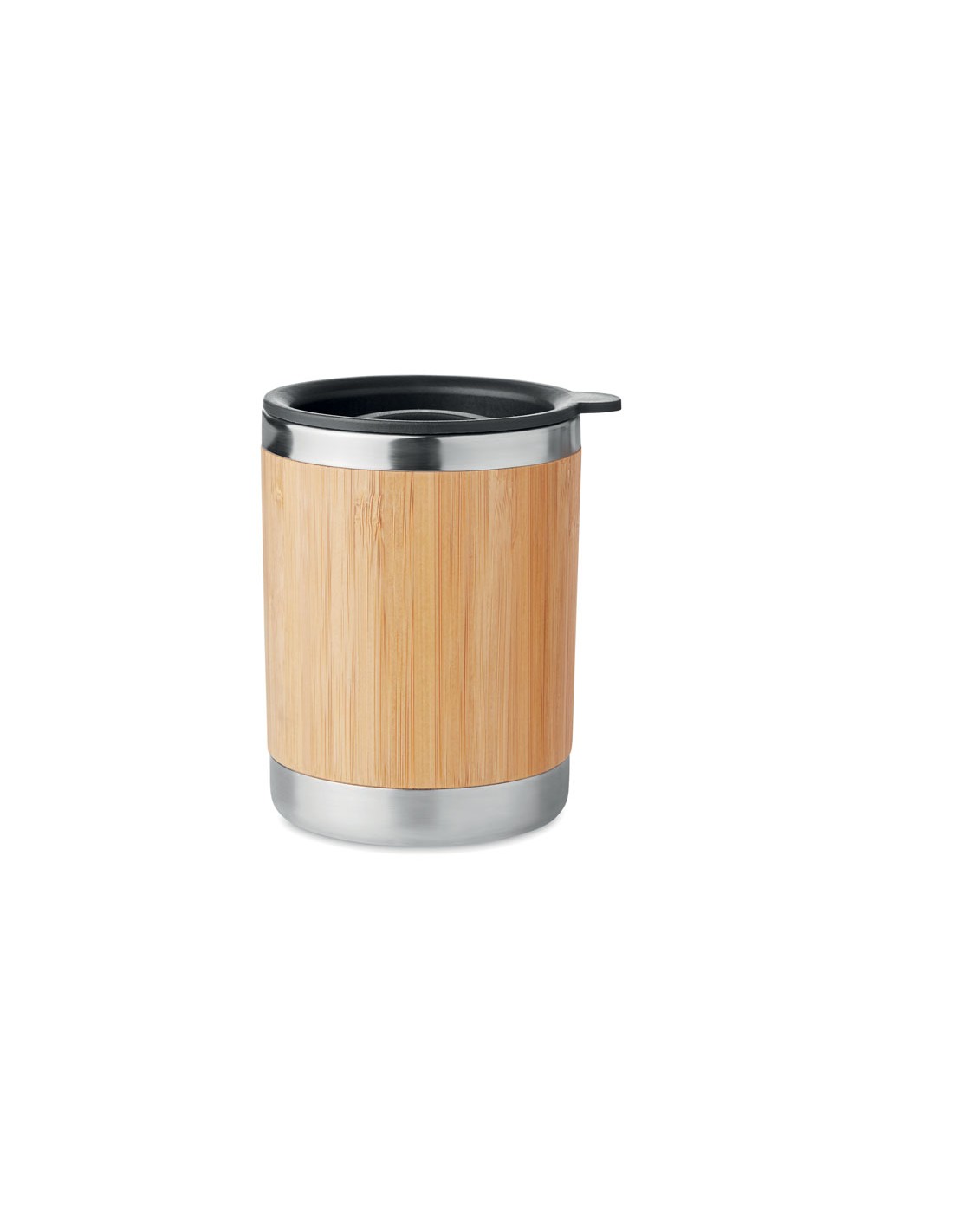 Vaso de acero inox. de doble pared con carcasa de bambú. Capacidad 250 ml. El bambú es un producto natural, puede haber ligeras variaciones en el color y el tamaño por artículo, lo que puede afectar el resultado final de la impresión.