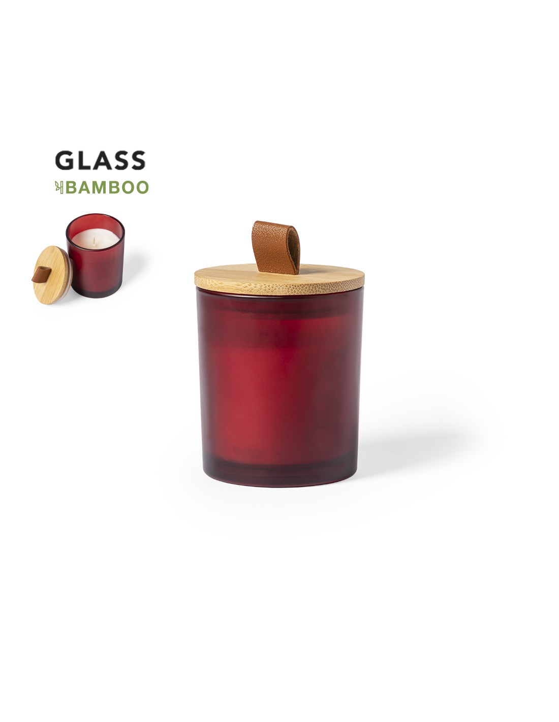 Velas en diferentes colores y aromas presentadas en un tarro translúcido de cristal con tapa de bambú